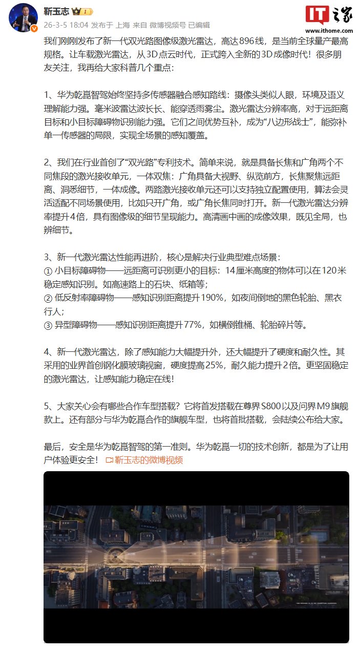 靳玉志再谈新一代双光路图像级激光雷达,强调华为乾崑智驾始终坚持多传感器融合感知路线